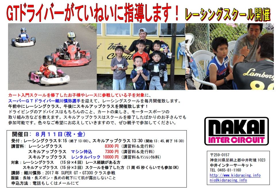 8月11日(祝・金) カート・レーシングスクール開催|神奈川でカート、ポケバイ、バイクのレンタル・レースなら中井インターサーキットへ 営業時間 平日13:00~20:00 土・日・祝8:00~20:00 定休日水・木